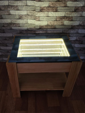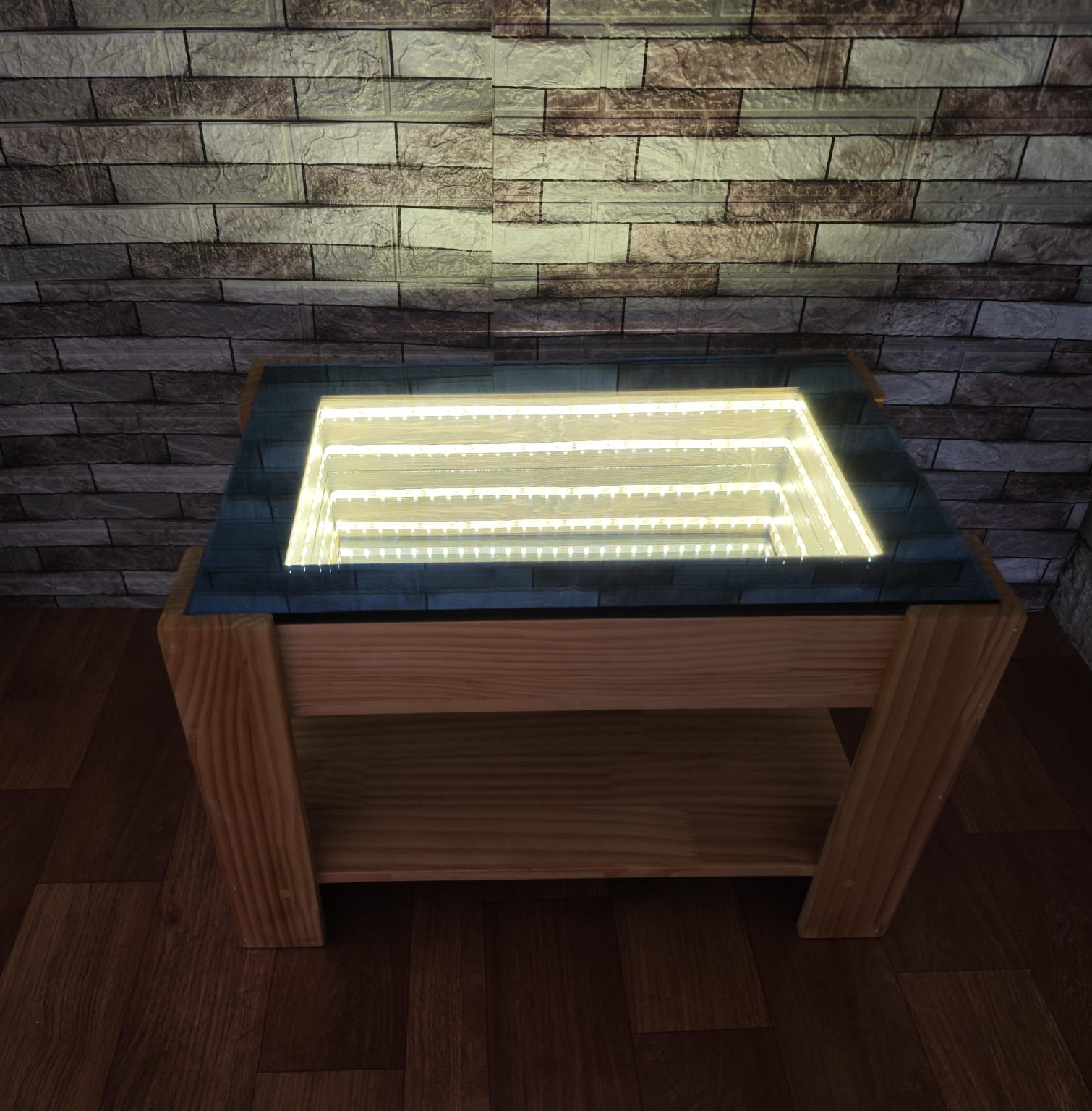 Hermosa mesa de centro en madera y vidrio, que al encenderse proyecta el efecto de un agujero sin fondo.
