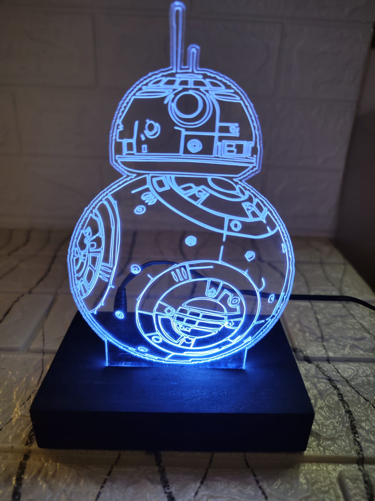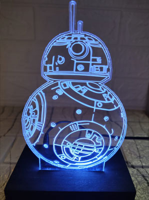 Acrílico tallado con base de madera, posee un efecto de iluminación que proyecta una imagen en color.